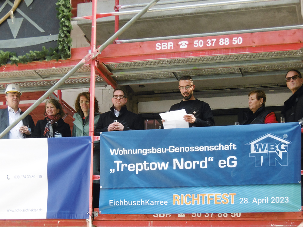 Am 8. Juli 2022 wurde der Grundstein für das moderne Neubauprojekt „EichbuschKarree“ gelegt, ein weiterer wichtiger Meilenstein an Wohnangeboten für die Mitglieder der Genossenschaft. In 2023 erfolgte dann auch schon das feierliche Richtfest für den Neubau in der Eichbuschallee 9A, 9F, 9G.