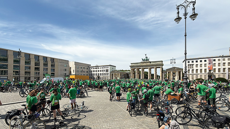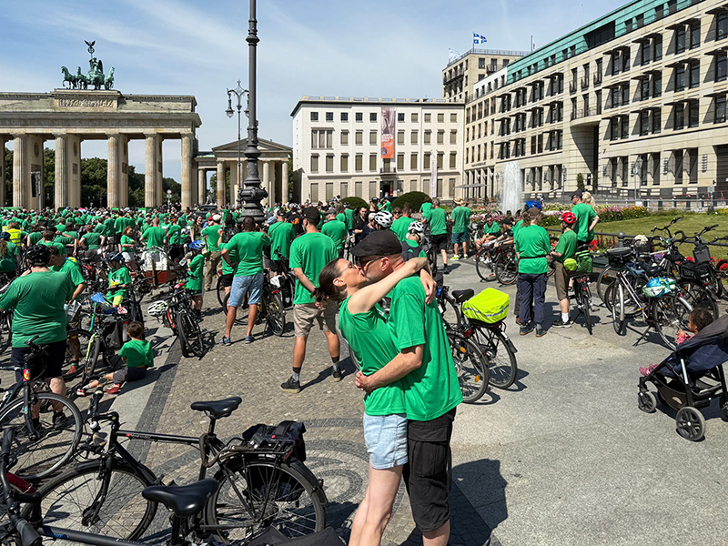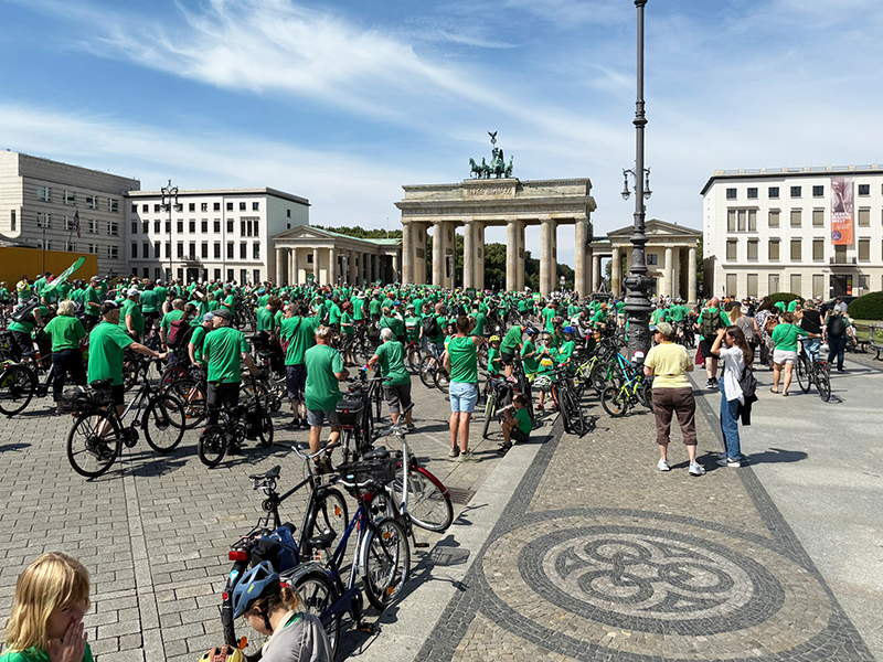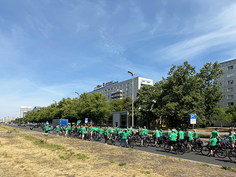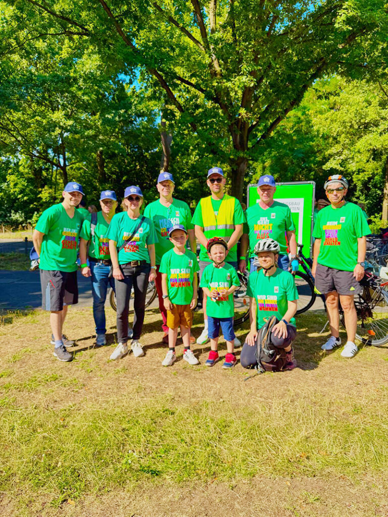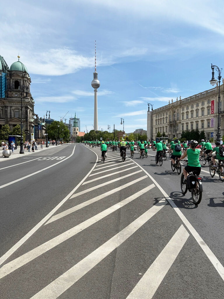 Gemeinsam mit unseren Mitgliedern haben wir an der Sternfahrt 2025 der Berliner Wohnungsbaugenossenschaften teilgenommen, die zum 4. Mal stattfand. Treffpunkt für uns war am „Zenner” im Plänterwald. Mit über 1.000 Radfahrerinnen und Radfahrern auf sechs Routen ging es durch die Hauptstadt bis zum Brandenburger Tor. In ihren grünen Trikots setzten die Teilnehmenden ein starkes Zeichen für Gemeinschaft, Fairness und Solidarität sowie für bezahlbares Wohnen. Unsere Fotos zeigen die besonderen Momente dieses Tages – von der gemeinsamen Fahrt durch Berlin über das beeindruckende Zusammentreffen am Brandenburger Tor bis hin zum gemeinschaftlichen Ausklang am Schloss Schönhausen der rundum gelungenen Veranstaltung.