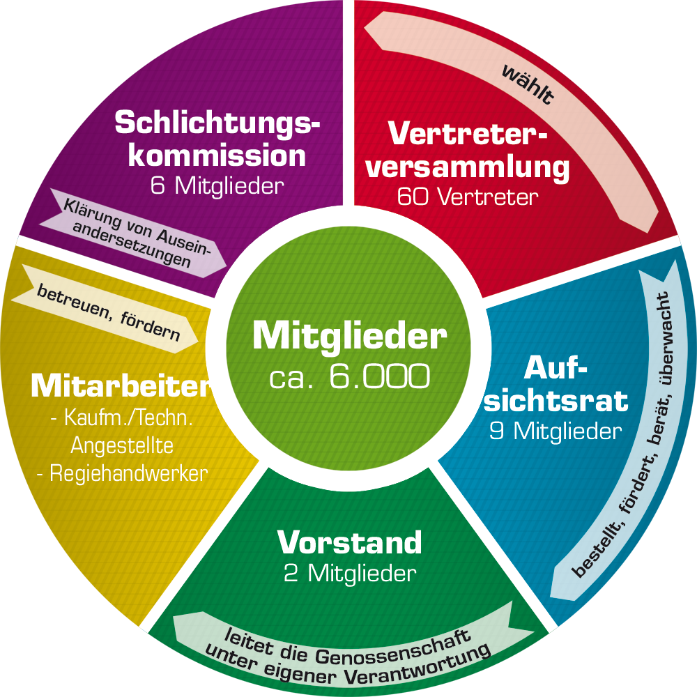 Die Wohnungsbaugenossenschaft wird durch die Organe Vorstand, Aufsichtsrat und Vertreterversammlung entsprechend der jeweiligen Aufgaben auf der Grundlage der Satzung und des Genossenschaftsgesetzes geleitet.