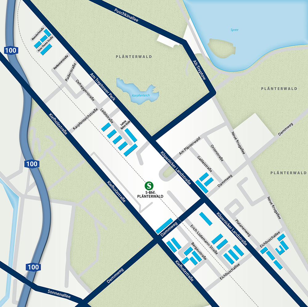 Das Wohngebiet Plänterwald liegt nahe am S-Bahnhof Plänterwald und bietet guten Anschluss durch einige Buslinien.